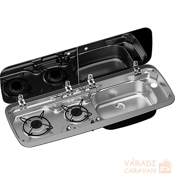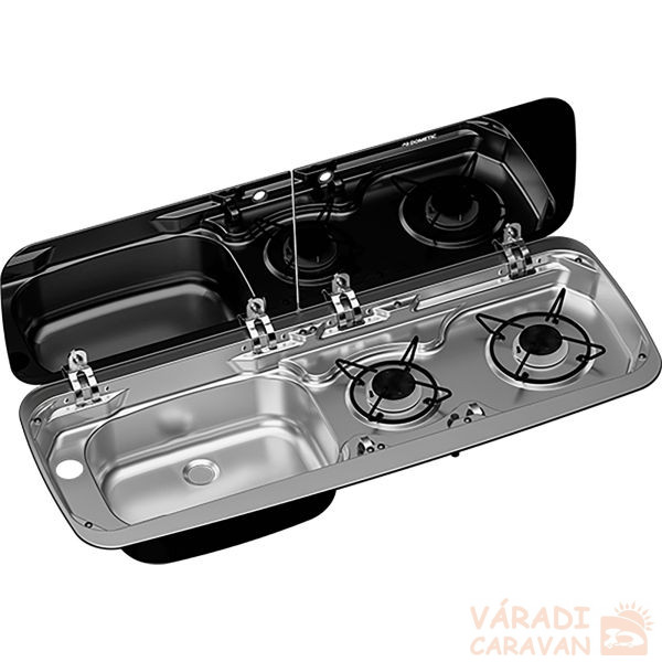 Beépített főzőlap és mosogató kombináció új dizájnban, különálló, kétrészes, fekete biztonsági üveg borítással. Zárt állapotban ez a borítás védi a főzőlapot és a mosogatót, valamint kiegészítő munkafelületként is szolgál. Automatikus kikapcsolás az üveg borítás zárásakor. Egy csaplyuk (ø 39 mm) előfúrva; a csapot külön kell megrendelni (cikkszám: 41 555). Biztonsági gyújtórendszerrel és elektromos gyújtással rendelkezik (12 voltos csatlakozás szükséges). Teljesítmény: 1 x 1 kW, 1 x 1,6 kW, energiafogyasztás: 204 g/h. Beépítési mélység: 16 cm, kivágási méretek: 88,3 x 30,7 cm, külső méretek: 90 x 37 cm, súly: 5,7 kg.